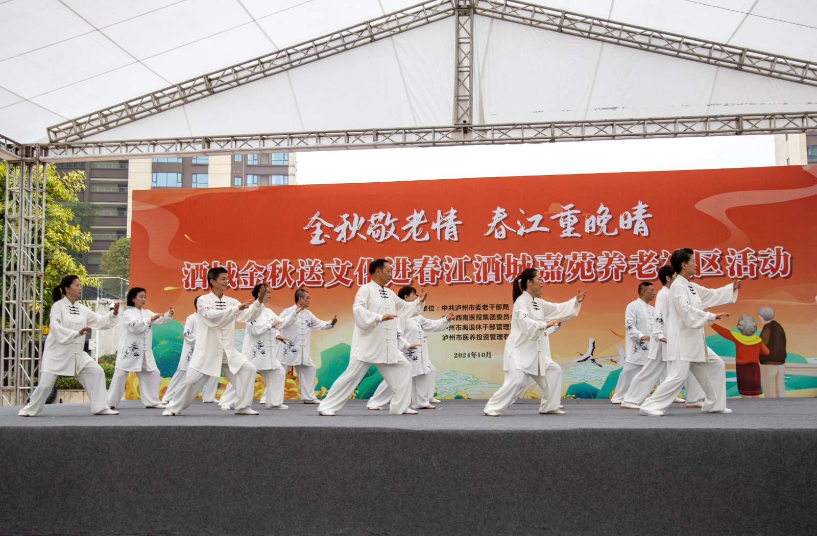 金秋送爽,丹桂飄香。為弘揚(yáng)中華民族尊老愛老的傳統(tǒng)美德,豐富老年朋友的文化生活,增強(qiáng)老同志的獲得感和幸福感,10月10日,由瀘州市委老干部局與西南醫(yī)投集團(tuán)聯(lián)合舉辦的“金秋敬老情·春江重晚晴”酒城金秋送文化活動在春江酒城嘉苑養(yǎng)老社區(qū)舉行,為社區(qū)老年朋友獻(xiàn)上了一場文化盛宴。市委組織部副部長、老干部局局長唐雯,瀘州發(fā)展控股集團(tuán)副總經(jīng)理、西南醫(yī)投集團(tuán)黨委書記、董事長林健出席活動。